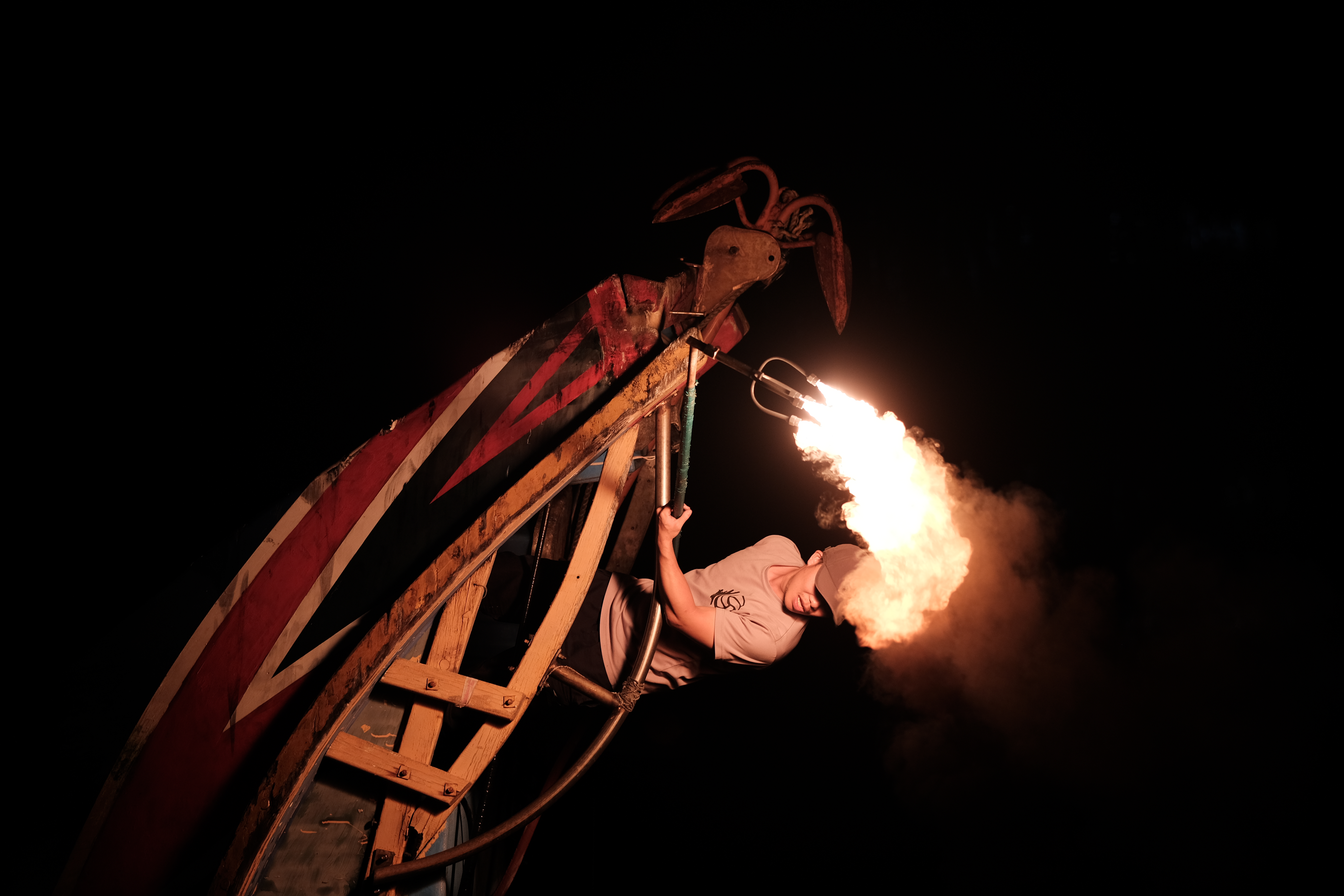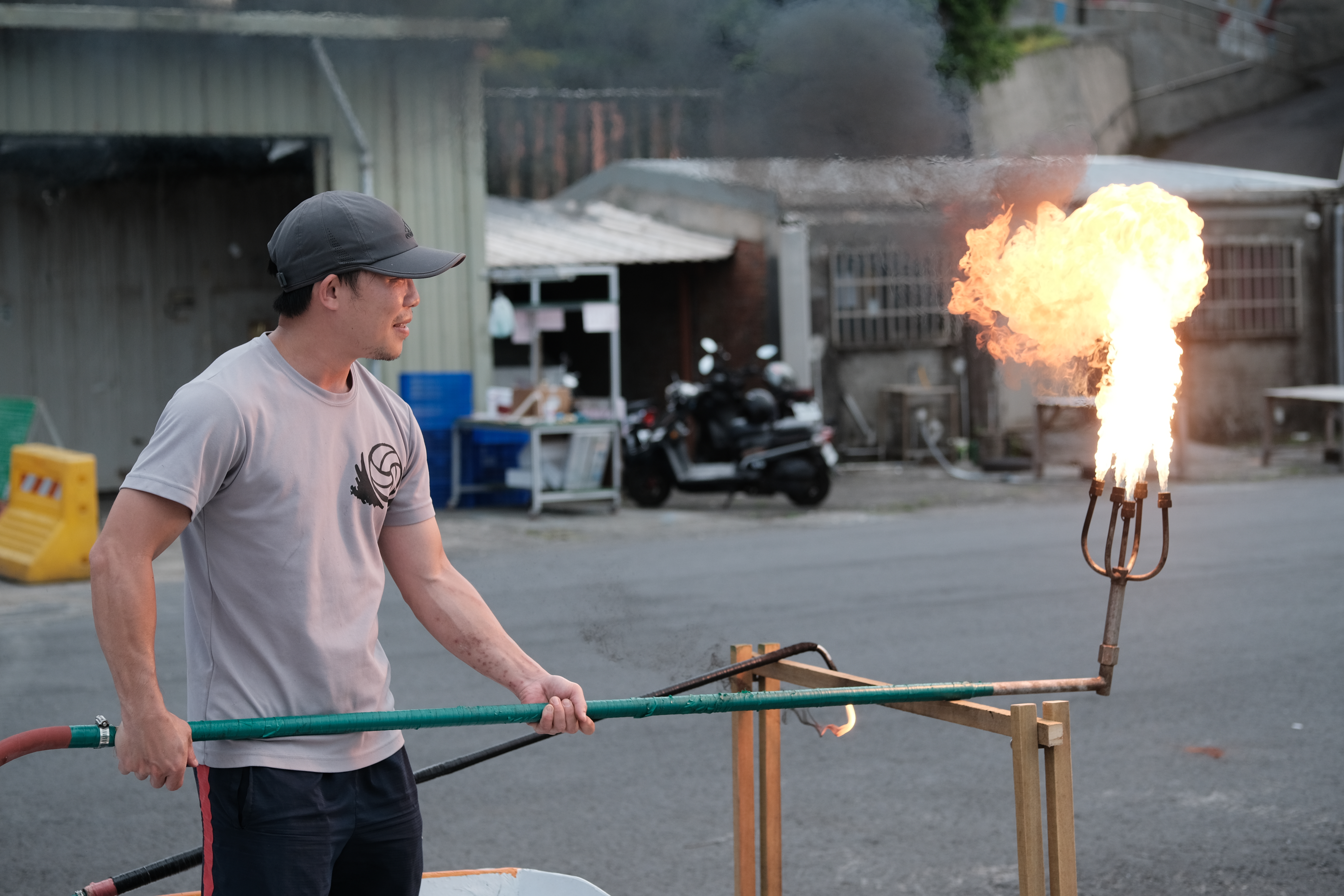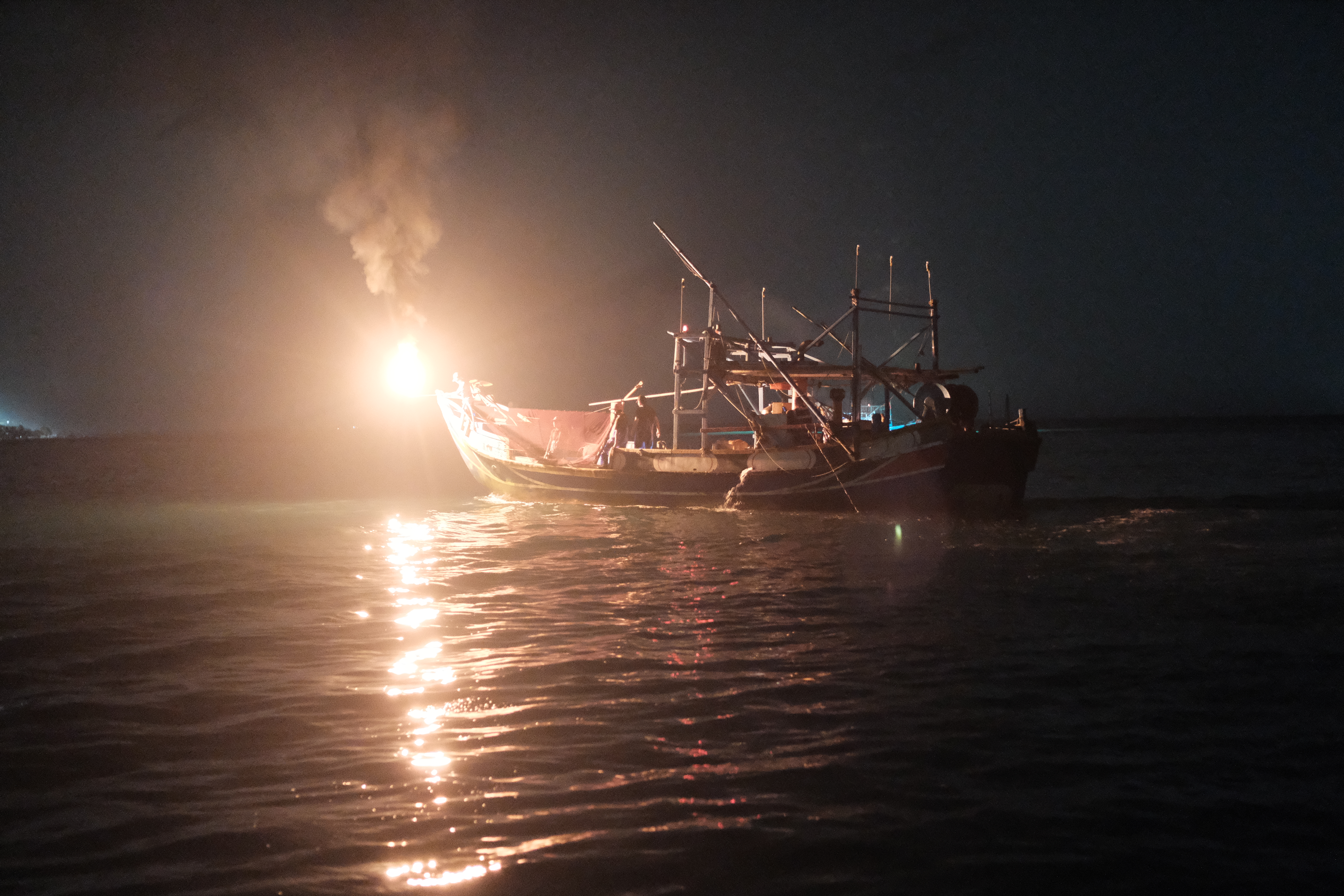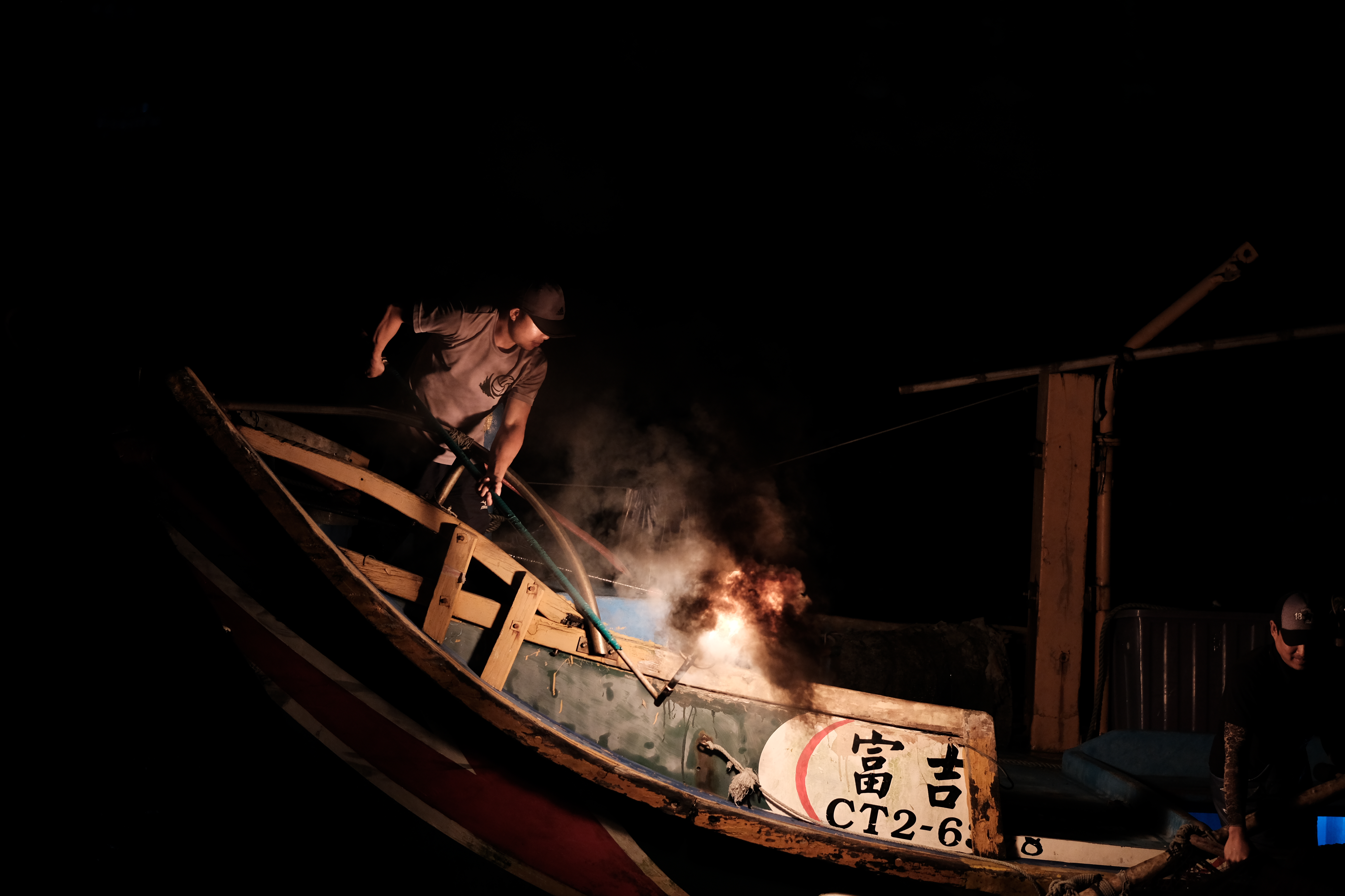 當夕暮低垂,夜色籠罩台灣金山磺港漁港的海面,正是如同海龍王般藍綠紅配色的蹦火船,點亮傳承百年的火光之時。站在船頭前方的火長,一鎖定魚群便以火炬點燃手中的磺火管照亮海面;位於船身的操網手則在火長的吆喝下,迅速將被稱為「桸仔」的叉手網放入海中,打撈因耀眼火光而跳出水面的青鱗魚。