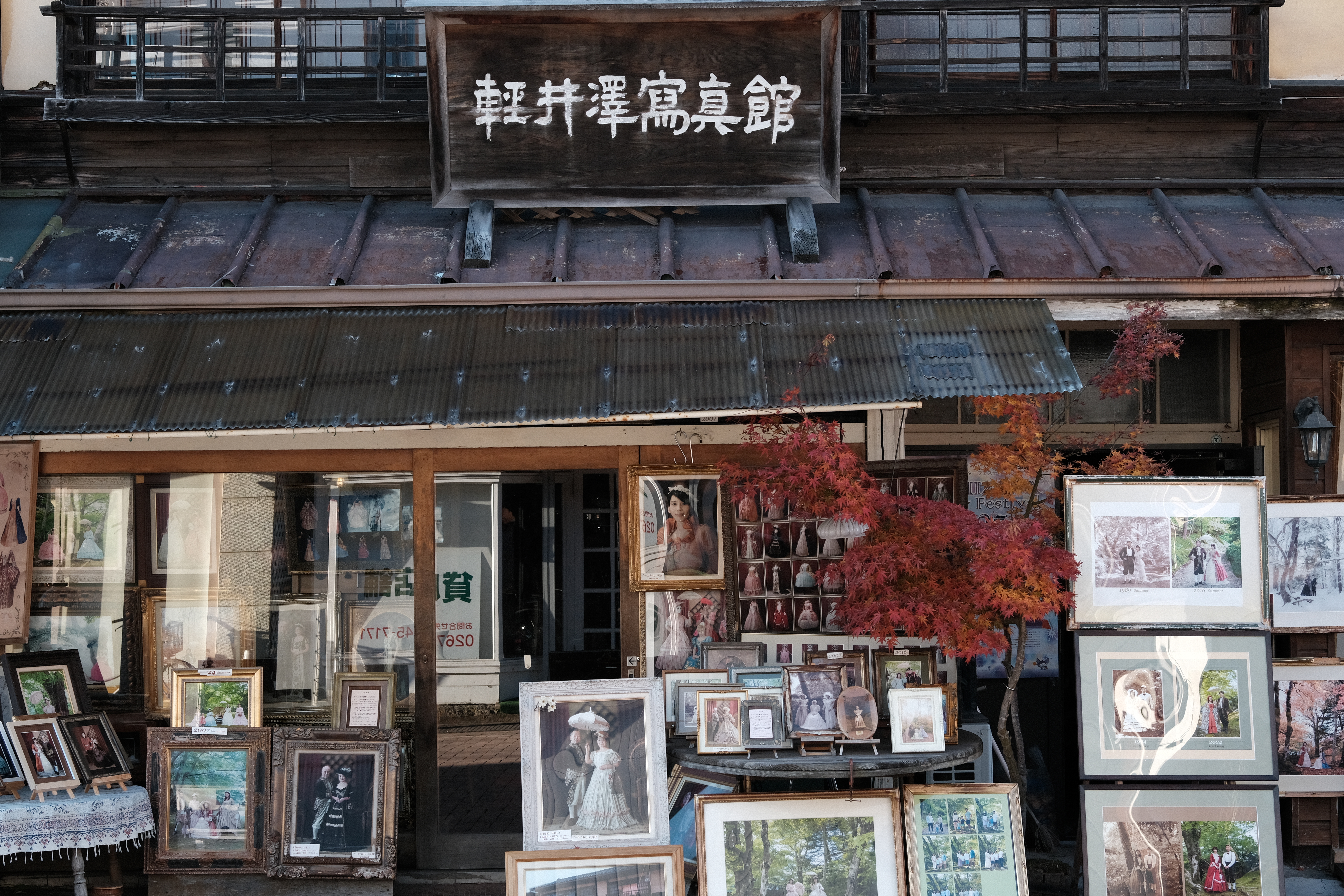 木製招牌上寫著寫真館幾個大字,多幅裝有精美照片的相框擺放在店面門口,座落於舊輕井澤銀座通其中的輕井澤寫真館,是一家特別以復古拍攝為主要風格的照相館。